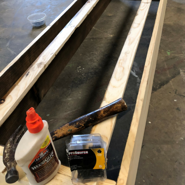 Counter sink all your nail holes and fill with Elmer’s Wood Filler. Attach the back using the 2″ finish nails. (Don’t forget to stain before you attach it)….been there, done that.