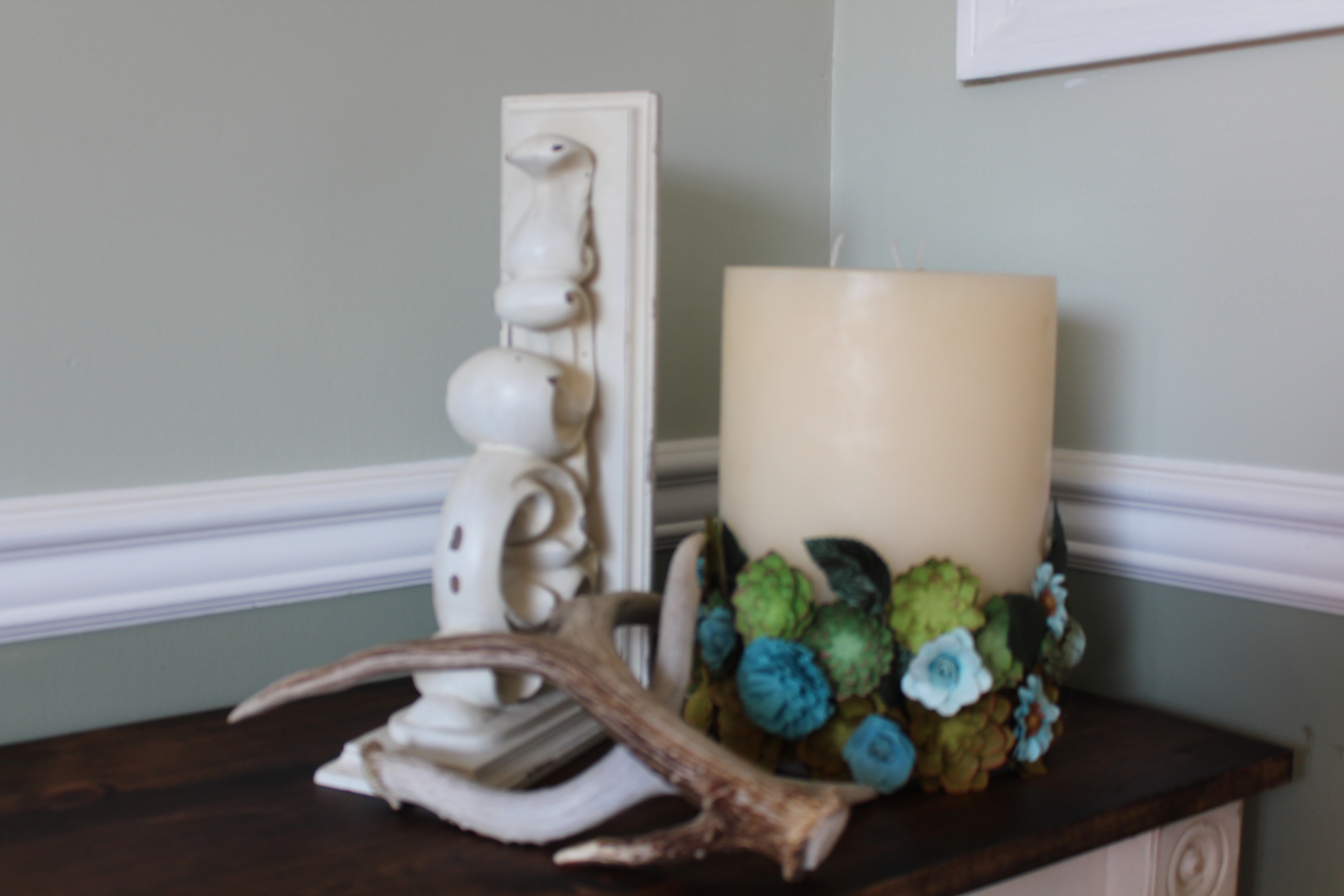 I found this candle last year at a thrift store, on sale! for only $8.00! It’s huge, and it was, did I mention, on sale!! and it has 3 wicks and would light up a room for at least  a fortnight.